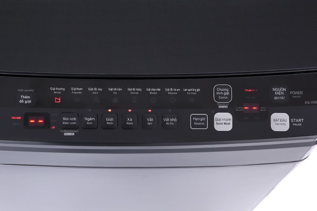 Máy giặt Sharp Inverter 9.5 Kg ES-X95HV-S được trang bị bảng điều khiển nút nhấn có hỗ trợ song ngữ Anh - Việt. Trên bảng điều khiển sẽ có nhiều chương trình giặt như: giặt thơm, giặt tiết kiệm, giặt đồ mỏng, đồ dày, đồ trẻ em, giặt chăn mền, giặt thường, làm sạch lồng giặt (Xem thêm chi tiết tại bảng TSKT). Đối với chương trình giặt đồ dày, máy giặt sẽ hoạt động với công suất mạnh mẽ hơn, đảm bảo các loại vải dày vẫn được giặt sạch sâu.